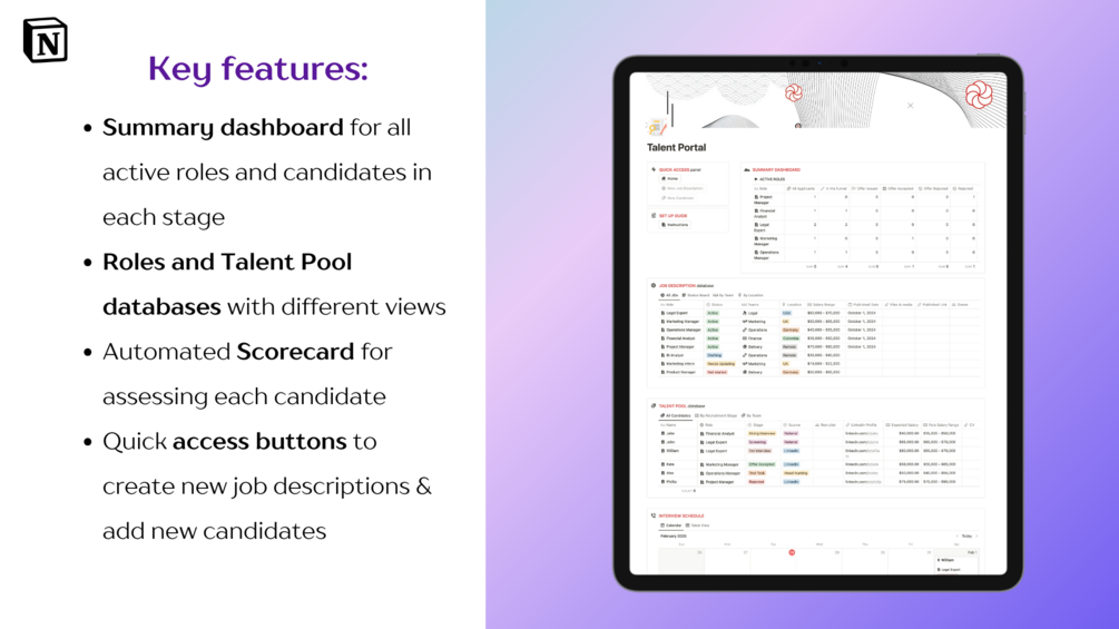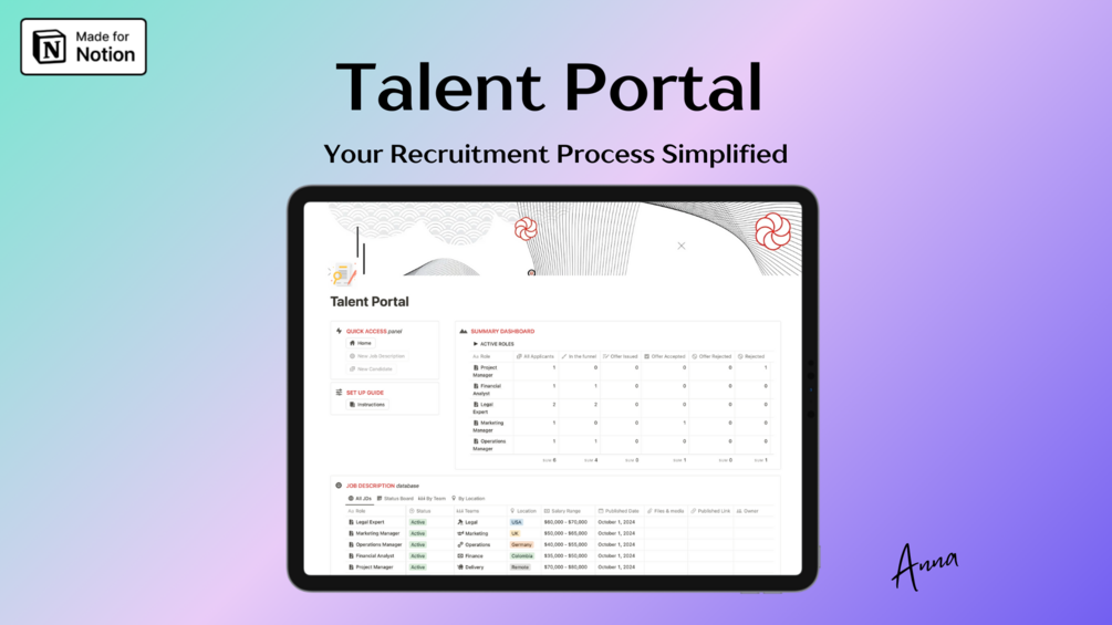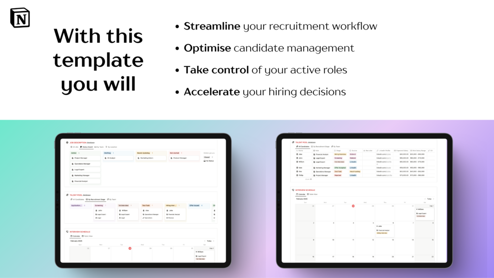 Take control of your hiring process with Talent Portal, the Notion dashboard designed to help you streamline recruitment, manage applicants, and stay organised throughout the hiring journey.